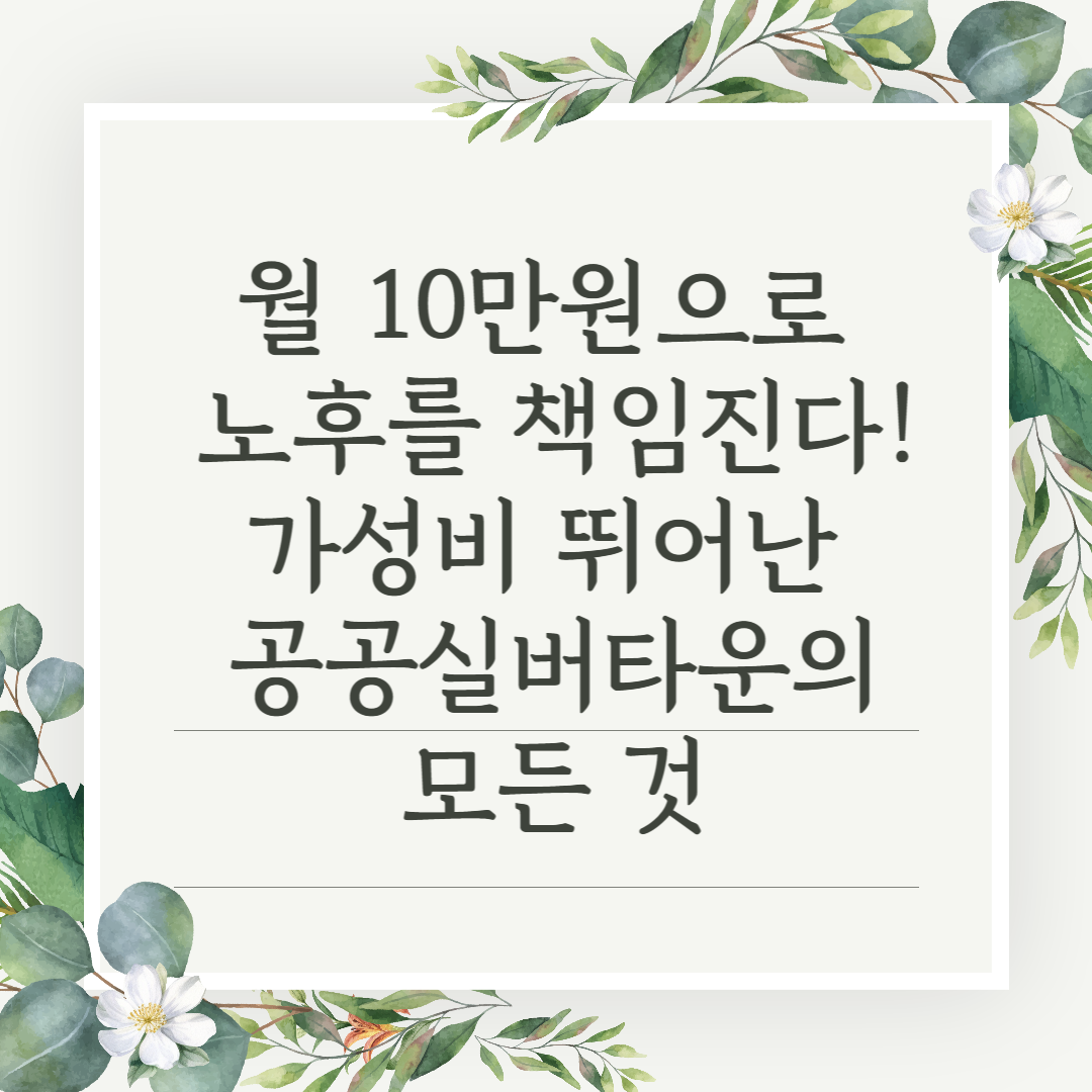 노후를 준비하는 많은 사람들의 공통 고민은 바로 '비용'입니다. 안정적인 노후를 보내기 위해 민간 실버타운에 입주하려고 하면 매월 수백만원에 달하는 높은 비용이 부담으로 다가옵니다. 하지만 최근 주목받는 '공공실버타운'은 월 10만원 정도의 저렴한 비용으로도 우수한 시설과 품격 있는 생활을 제공하고 있어 화제입니다.