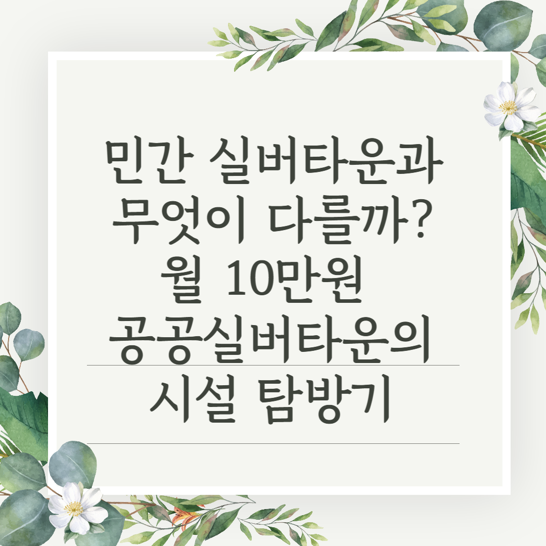6. 실입주자의 만족도 및 후기 비교민간 시설은 고가인 만큼 만족도는 높지만, 비용 부담으로 인해 중도 퇴거하는 사례도 있습니다. 공공실버타운의 경우 합리적인 가격으로 인해 입주자의 만족도가 매우 높고, 생활 만족도 역시 매우 긍정적입니다. 실제 입주자들의 후기를 보면, 경제적 부담 없이 풍요로운 삶을 누리고 있다는 긍정적인 평가가 많습니다.결론 - 공공실버타운, 현명한 노후의 선택민간 실버타운과 공공실버타운은 모두 훌륭한 노후 주거시설입니다. 하지만 시설의 품질, 건강 관리 서비스, 접근성 등 여러 측면에서 비교할 때 공공실버타운은 월 10만원으로 놀라운 가성비를 자랑합니다. 더 이상 비싼 비용에 걱정하지 말고, 경제적이고 품격 있는 생활을 제공하는 공공실버타운에서 행복한 노후를 준비해보세요.