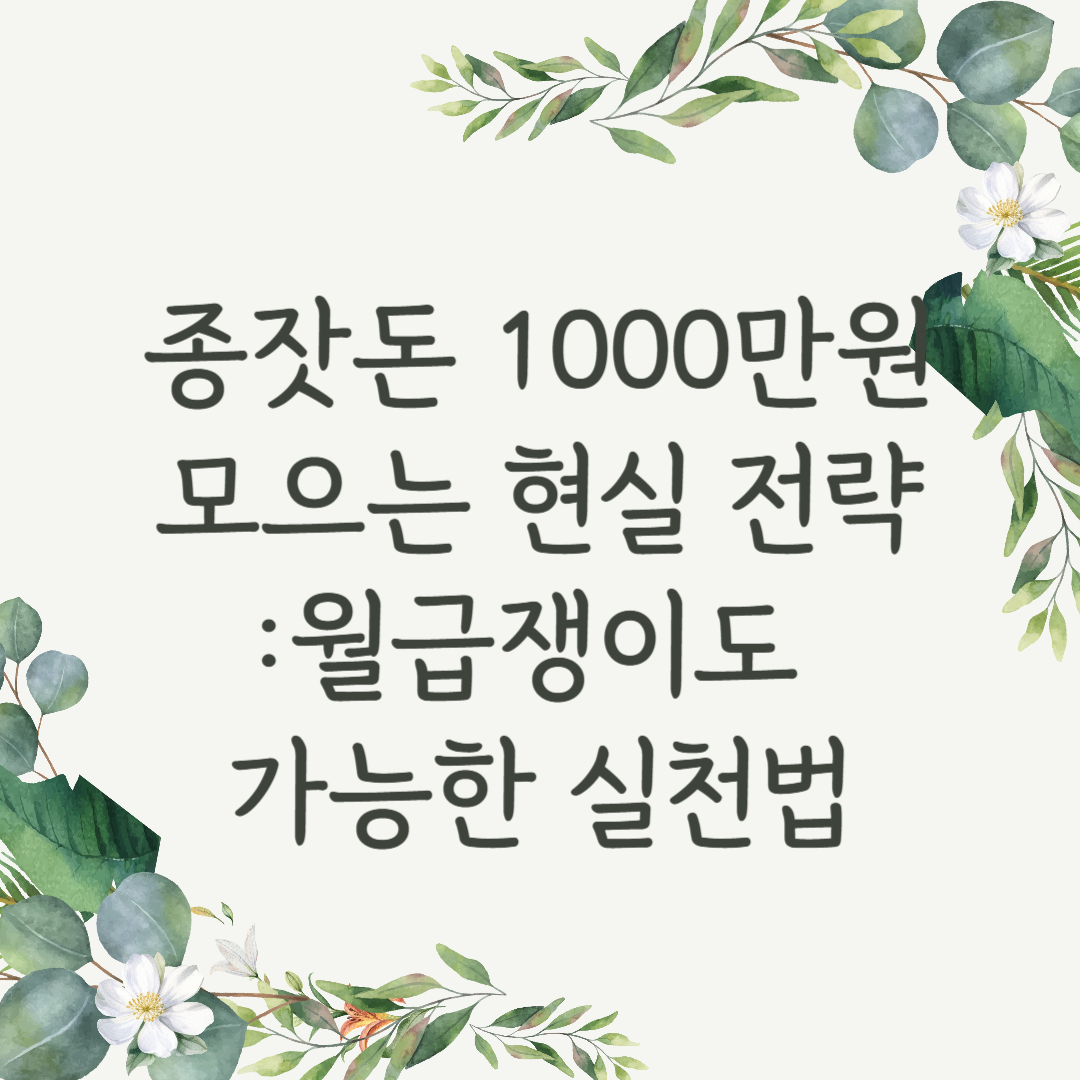종잣돈 1000만 원, 누구나 현실적으로 모을 수 있습니다 1000만 원이라는 금액은 생각보다 크지만, 하루 3,000원씩 줄이는 것부터 시작해도 1년에 100만 원 이상이 절약됩니다. 작은 실천이 쌓여 큰 돈이 됩니다. 이제는 결심이 아니라 실천의 시간입니다. 오늘, 통장 하나 만드는 것부터 시작해보세요.